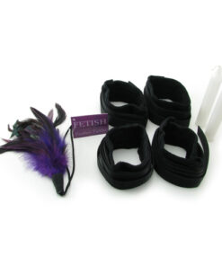 Beginners Bondage Set für zarte Extremspielchen! Dieses Set besteht aus vier Samtfesseln mit Nylonband, zwei Kerzen, einem weichen Feder Tickler und einer Satinaugenbinde. Erleben Sie den Nervenkitzen und leben Sie Ihre Fetish-Phantasien! Ein Highlight für jede Liebesnacht.