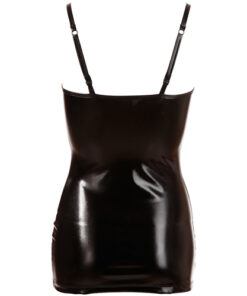Eng anliegendes Minikleid im schwarzen Wetlook mit Hingucker-Schnür-Dekolleté. Träger verstellbar. Schwarz. 92% Polyester, 8% Elasthan.