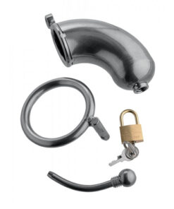 In der harten, kalten Umklammerung dieses Edelstahlkeuschheitskäfigs wird Ihr Sub keine Erektion haben! Zwei unterschiedlich große Ringe geben Ihnen die Möglichkeit zu sehen, wie eng das Gerät um seine Hoden herum ist, um so eine perfekte Passform zu gewährleisten. Ein optionaler, hohler Harnröhreneinsatz kann aufgeschraubt werden, damit er dadurch urinieren kann. Dieses einzigartige Design ist schwer, sodass es sein Paket herunterzieht und haltbar, sodass es ein Leben lang halten kann.