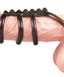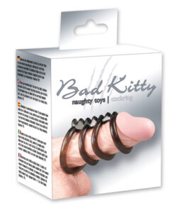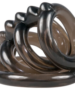 Penisringe-Quartett, verbunden mit einem gezackten Reizsteg. Ringdicke jeweils 8 mm. Ring-Ø 3 x 2,3 cm und 1 x 4,3 cm. Gesamtlänge 6,5 cm. Rauchschwarz. Material: TPE, phthalatfrei gemäß EU-Verordnung 1907/2006/EC.