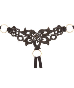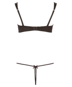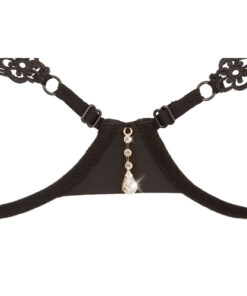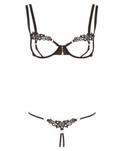 Schwarzes BH-Set bestehend aus einem BH mit offenen Cups und einem String ouvert. Der BH besteht nur aus Bügeln und Bändern mit hochwertiger Stickerei in Höhe der Brustwarzen und kleinem Strass-Accessoire zwischen den Cups. Im Rücken verfügt der BH über einen Hakenverschluss und die Träger sind in der Länge verstellbar. Der passende String ist im Schritt komplett offen und verfügt ebenfalls über eine Stickerei in der Front, die über drei kleine silberfarbene Ringe mit den Bändern verbunden ist. Hauptmaterial 95% Polyester, 5% Elasthan