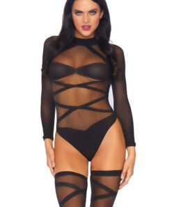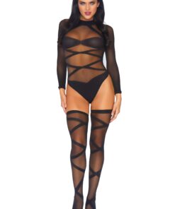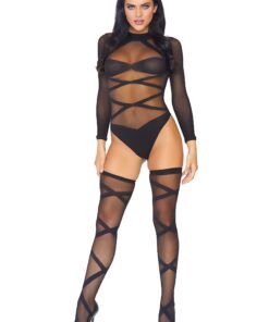 2-teiliger, blickdichter, durchsichtiger Criss-Cross-Body-Anzug und dazu passende Strümpfe