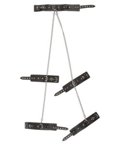 Dieses Gurtzeug ist alles was Sie brauchen! Es wird mit einem Halsband, Manschetten und einer Kette mit Karabinerhaken geliefert, die dafür sorgen, dass alles an Ort und Stelle bleibt. Das Set enthält 2 Bondage-Bänder, die am Handgelenk oder an den Knöcheln befestigt werden können. An den Oberarmen können zwei zusätzliche Gurte angebracht werden. Das Lederhalsband ist an den Manschetten und der Kette (1 Meter) befestigt. Alle Bänder sind verstellbar und angenehm zu tragen.