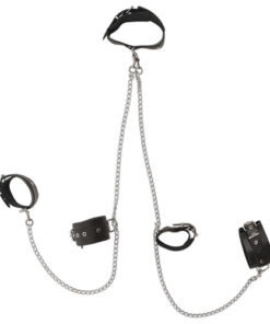 Dieses Gurtzeug ist alles was Sie brauchen! Es wird mit einem Halsband, Manschetten und einer Kette mit Karabinerhaken geliefert, die dafür sorgen, dass alles an Ort und Stelle bleibt. Das Set enthält 2 Bondage-Bänder, die am Handgelenk oder an den Knöcheln befestigt werden können. An den Oberarmen können zwei zusätzliche Gurte angebracht werden. Das Lederhalsband ist an den Manschetten und der Kette (1 Meter) befestigt. Alle Bänder sind verstellbar und angenehm zu tragen.