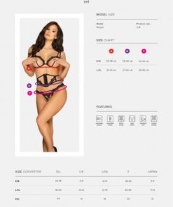 Dieses 3-teilige Bravelle-Set ist Teil einer wunderschoen detaillierten, aufregenden Serie. Das Set besteht aus einem offenen BH mit verstellbaren Traegern, einem sexy Taillenguertel und einem passenden Tanga mit offenem Schritt. Das Set hat ein auffaelliges Design und ist aus weichem, dehnbarem Material fuer eine schoene Passform gefertigt.Tipp: Finde einfach die richtige Groesse anhand der Groessentabelle im letzten Bild.