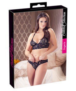 Schwarzes Dessous-Set mit Verschluss vorne. Der Spitzen-BH und der Slip lassen sich einfach mit dem Hakenverschluss an der Vorderseite lösen. Aus seidiger, elastischer Spitze für optimalen Tragekomfort.