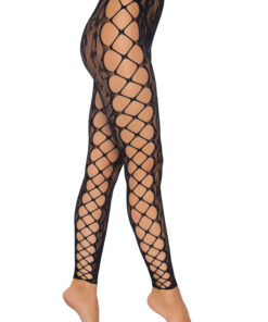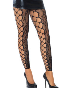 Leoparden-Spitzenstrumpfhose ohne Schritt mit seitlichem Netzeinsatz.