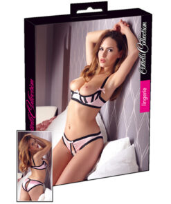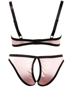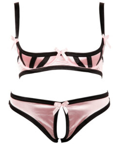 Set aus rosafarbenem Satin mit schwarzen Details. Bügel-Hebe mit leicht gefütterten Cups und verstellbaren Trägern. Häkchenverschluss hinten. Dazu passender Slip, im Schritt offen. 88% Polyamid, 12% Elasthan. Ohne Strümpfe.