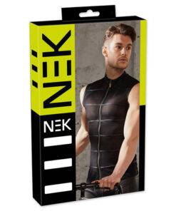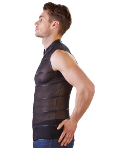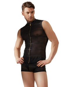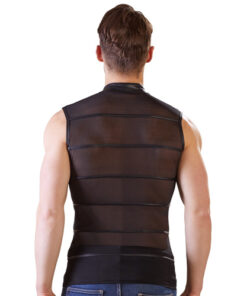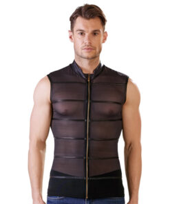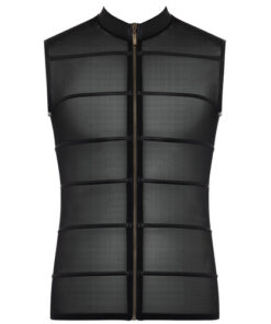 Schwarzes, ärmelloses Shirt aus transparentem Powernet, unterbrochen von matt-schwarzen Streifen mit kleinem Stehkragen und durchgehendem Reißverschluss in der Front.