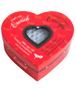Pärchenspiel. Rote, stabile Herzschachtel mit 100 Papierröllchen, auf denen erotische Herausforderungen stehen, die von IHR bzw. IHM gemeistert werden müssen. Inklusive Pinzette, um die Röllchen aus der Schachtel zu ziehen. Schachtel-Ø ca. 15 cm. Sprache: Niederländisch und Französisch.