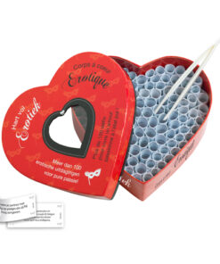 Pärchenspiel. Rote, stabile Herzschachtel mit 100 Papierröllchen, auf denen erotische Herausforderungen stehen, die von IHR bzw. IHM gemeistert werden müssen. Inklusive Pinzette, um die Röllchen aus der Schachtel zu ziehen. Schachtel-Ø ca. 15 cm. Sprache: Niederländisch und Französisch.