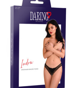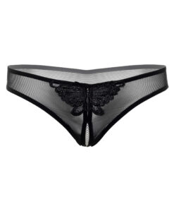 Indra String im Schritt ohne Perlen. Schmetterlingsapplikation im Schritt aus transparentem Mesh mit Kunstperlen in der Schrittöffnung.