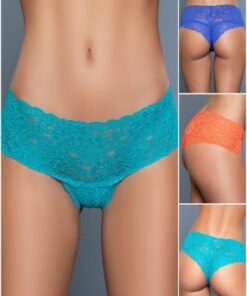 Dieses Set enthaelt 3 Spitzentangas in Kobaltblau, Neonorange und Tuerkis. Der elastische Bund garantiert eine gute Passform.