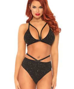 2 Stück Schimmernder, blickdichter Lurex-Käfig-Träger-BH und passender trägerloser brasilianischer Unterteil.