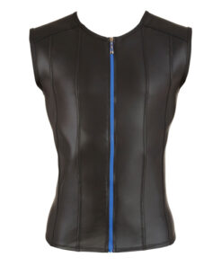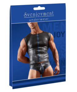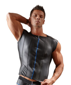 Fühlen Sie sich sexy und taff, mit diesem verführerischen schwarzen Shirt im Leder-Look. Das Shirt hat einen großen blauen Reißverschluss, damit sie es schnell ausziehen können, wenn die Situation heiß wird. Das Shirt dehnbar für gute Passform und angenehmen Tragekomfort. Tragen Sie es in Kombination mit einem sexy G-String, Boxershorts, Hosen oder mit gar nichts, und seien Sie bereits für eine Nacht voll Leidenschaft und Verführung mit Ihrem Partner.