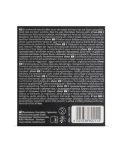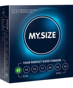 Die Kondome der deutschen Marke MySize werden in verschiedenen Größen hergestellt, so findet man immer passgenaue Kondome. Das Tragen eines gut sitzenden Kondoms ist nicht nur angenehmer, es erhöht auch die Sicherheit bei der Anwendung.Diese Kondome mit einer Weite von 47 mm sind straffere Kondome mit folgenden Abmessungen:Nennweite: 47 mmFür Penis-Umfang: 9,5 – 9,9 cmLänge: 160 mmMerkmale der Kondome:Geschmack: neutralGleitmittel: normalFarbe: transparentBeschaffenheit: glattGröße: strafferNennweite: 47 mmDicke: normalStück in der Verpackung: 3Marke: MySize