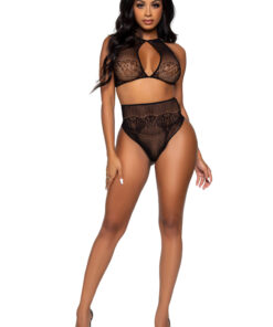 2 PC Dotted net keyhole halter crop top with lace accents and high waist tanga panty.