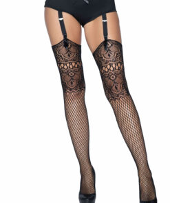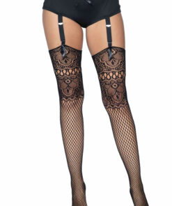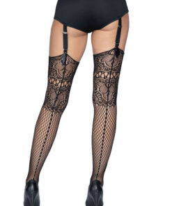 Netzstrümpfe mit Spitzenabschluss und Rückennaht.