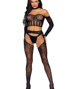 3 PC. Langärmeliges Neckholder-Crop-Top aus Spitze, Strumpfhalter aus Spitze und Stringtanga.