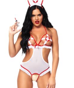 Die 2-teilige Naughty Nurse besteht aus einem schrittlosen Teddy mit offenen Cups und einem passenden Hut-Stirnband.