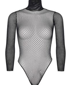 Netzstrumpfhose mit hohem Halsausschnitt und langen Ärmeln, mit Druckknopf im Schritt und Baumwollzwickel.