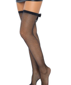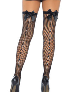 Netzstrümpfe mit strassbesetzter Rückennaht und Satinschleife auf der Rückseite.