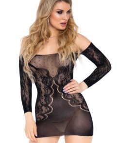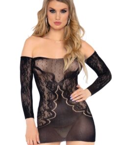 Langärmeliges, schulterfreies Minikleid aus Spitze.