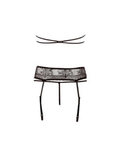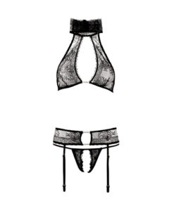 Soft-BH mit Halsband (2 Knöpfe hinten) und kleiner Strasskette zwischen den Cups. Clipverschluss hinten. Strapsgürtel mit vier verstellbaren Strapsen, vorne mit zwei kleinen Strassketten zur Verzierung. Zum Lieferumfang gehört ein passender String mit offenem Schritt. Schwarz. 90 % Polyamid, 10% Elastan.