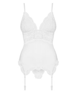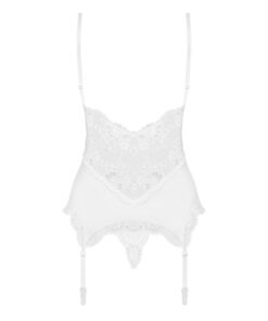 Strumpfband mit Spitze und tiefem Rücken. Die Schulter- und Strumpfgurte sind verstellbar. Inklusive passendem Stringtanga.