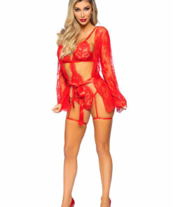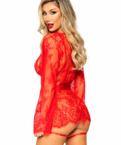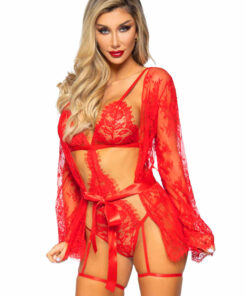 3 PC Eyelash Spitze Strumpfband Teddy mit G-String zurück und verstellbaren Trägern, Spitze Robe, und Band Krawatte.