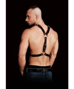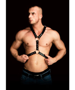 Mit einem großen O-Ring in der Mitte des Brustbereichs, eingefasst in kräftiges schwarzes Leder und verstärkt durch robuste Nieten, ist dieses Geschirr ein absoluter Hingucker! Auf beiden Seiten dieser zentralen Besonderheit sind zwei weitere O-Ringe und hochwertige Riemen aus Lederfaserstoff unter den Armen durch und über den Schultern verbunden. Beide Schultergurte haben robuste Schnallen, um die Passform bequem einzustellen. So ein Abenteuer war noch nie so einfach!