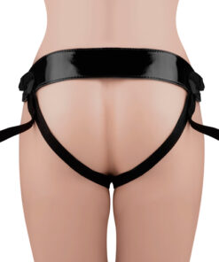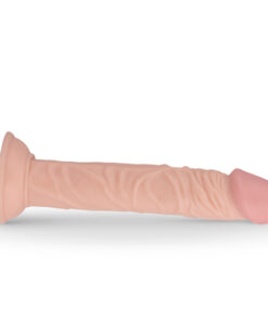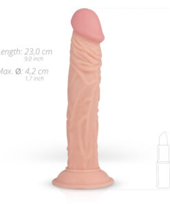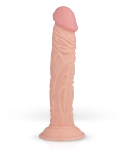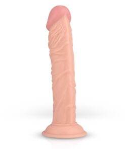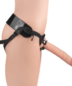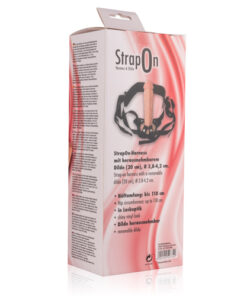 Geäderter Dildo in Penisform, der sich am beiliegenden schwarzen Umschnall-Gurt befestigen lässt.